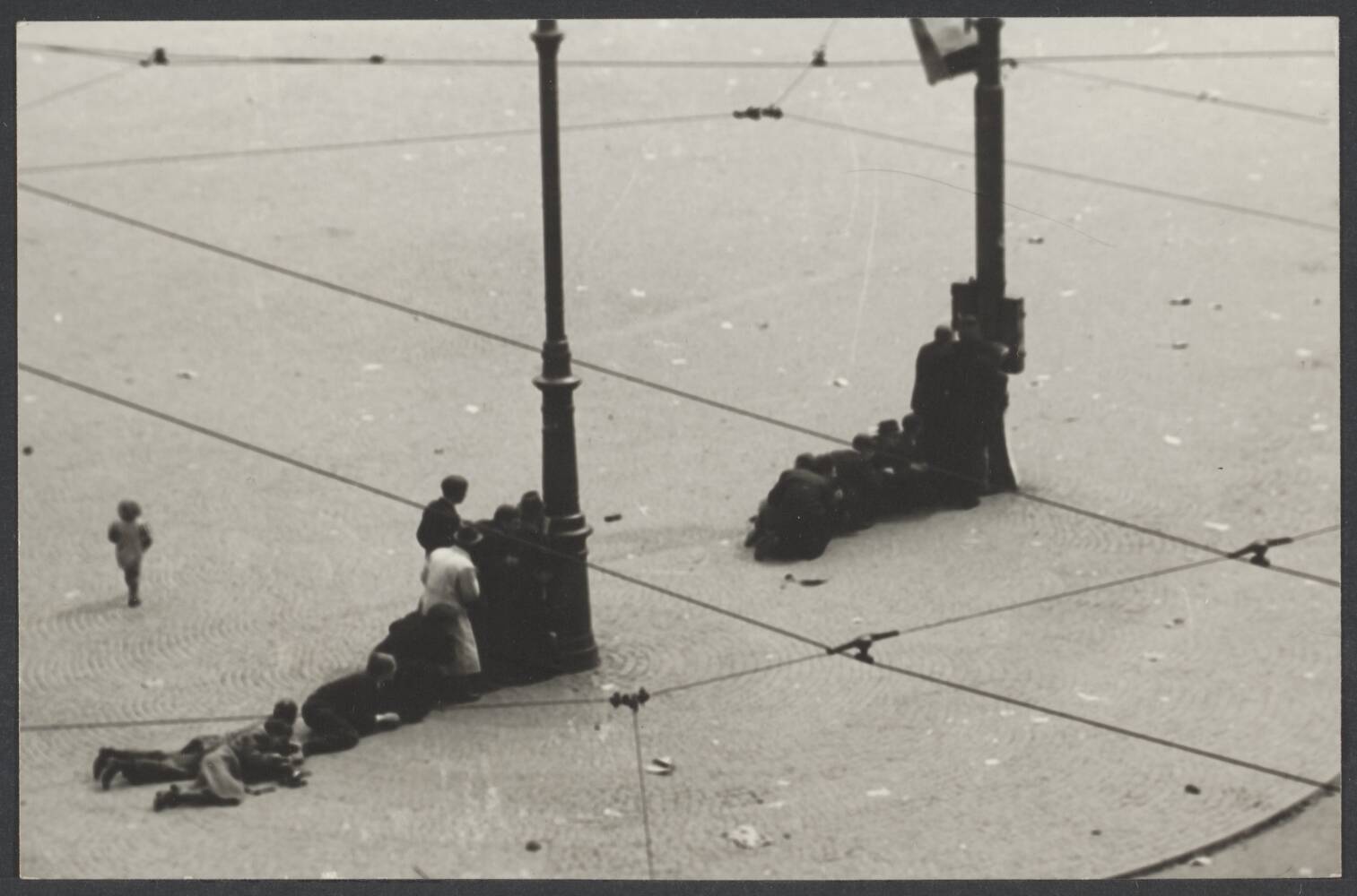 Mensen zoeken dekking op de Dam. Links loopt een een klein meisje over het plein. – Foto: Nationaal Archief / Rechtenvrij